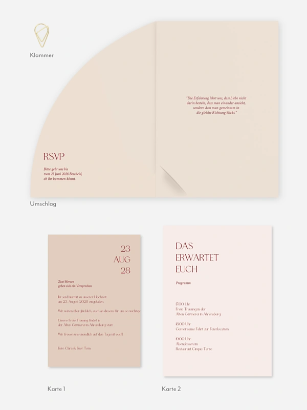 - Umschlag: 120 x 170 mm , Karte 1: 120 x 135 mm, Karte 2: 120 x 150 mm, Klammer: 25 mm