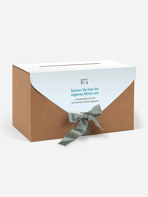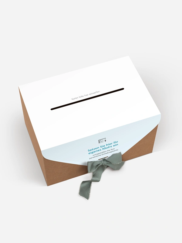 Unsere Kartenbox „Gestaltungsfreiheit“ ist die stilvolle und praktische Lösung, um Glückwunschkarten und Aufmerksamkeiten Ihrer Hochzeitsgäste sicher und dekorativ zu sammeln – und wird danach zur ganz persönlichen Erinnerungskiste voller Liebe. Die Box wird in drei Einzelteilen geliefert: der Box selbst, einem passenden Band und einer liebevoll gestalteten Hülle. Diese lassen sich im Handumdrehen zusammensetzen, sodass die Kartenbox schnell einsatzbereit ist. Die Hülle ist im passenden Design zur Hochzeitseinladung gestaltet und kann individuell personalisiert werden – für ein harmonisches Gesamtbild an Ihrem großen Tag.