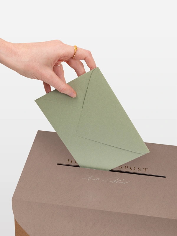 Unsere Kartenbox "Mocca Moments" ist die perfekte Kombination aus Funktionalität und Eleganz. Sie sammelt sicher Glückwunschkarten, Umschläge und kleine Aufmerksamkeiten Ihrer Gäste. Die Kartenbox wird flach geliefert und lässt sich einfach zusammenbauen. Sie enthält eine individuell gestaltbare Papierhülle sowie ein farblich passendes Band. Nach dem Aufbau fügt sie sich stimmig in Ihr Papeterie-Konzept ein und wird zu einem dekorativen Blickfang mit praktischem Nutzen.