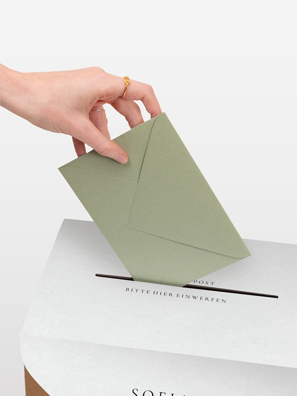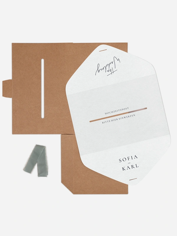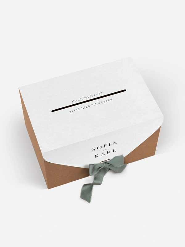 Unsere Kartenbox "Zarte Liebe" ist die perfekte Kombination aus Funktionalität und Eleganz. Sie sammelt sicher Glückwunschkarten, Umschläge und kleine Aufmerksamkeiten Ihrer Gäste. Die Kartenbox wird flach geliefert und lässt sich einfach zusammenbauen. Sie enthält eine individuell gestaltbare Papierhülle sowie ein farblich passendes Band. Nach dem Aufbau fügt sie sich stimmig in Ihr Papeterie-Konzept ein und wird zu einem dekorativen Blickfang mit praktischem Nutzen.
