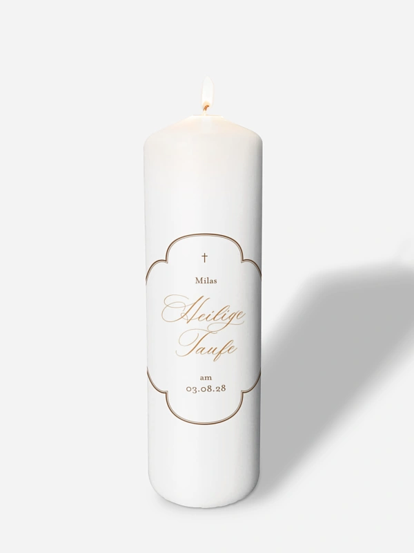 Die Kerze zur Taufe "Classic Garden" begleitet euren besonderen Tag mit einem leisen, warmen Leuchten – und wird danach zum schönen Erinnerungsstück für zuhause. Das zeitlose Design mit feinen Details wirkt festlich, ohne laut zu sein, und passt wunderbar zur Tauffeier oder als Geschenk von Pat:innen und Familie. Mit Name und Datum wird daraus eine persönliche Taufkerze, die eurem Moment eine eigene Handschrift gibt. Du kannst die Kerze ganz einfach im Gestaltungs-Tool personalisieren, und wir sorgen für hochwertige Qualität und schnelle Lieferung.