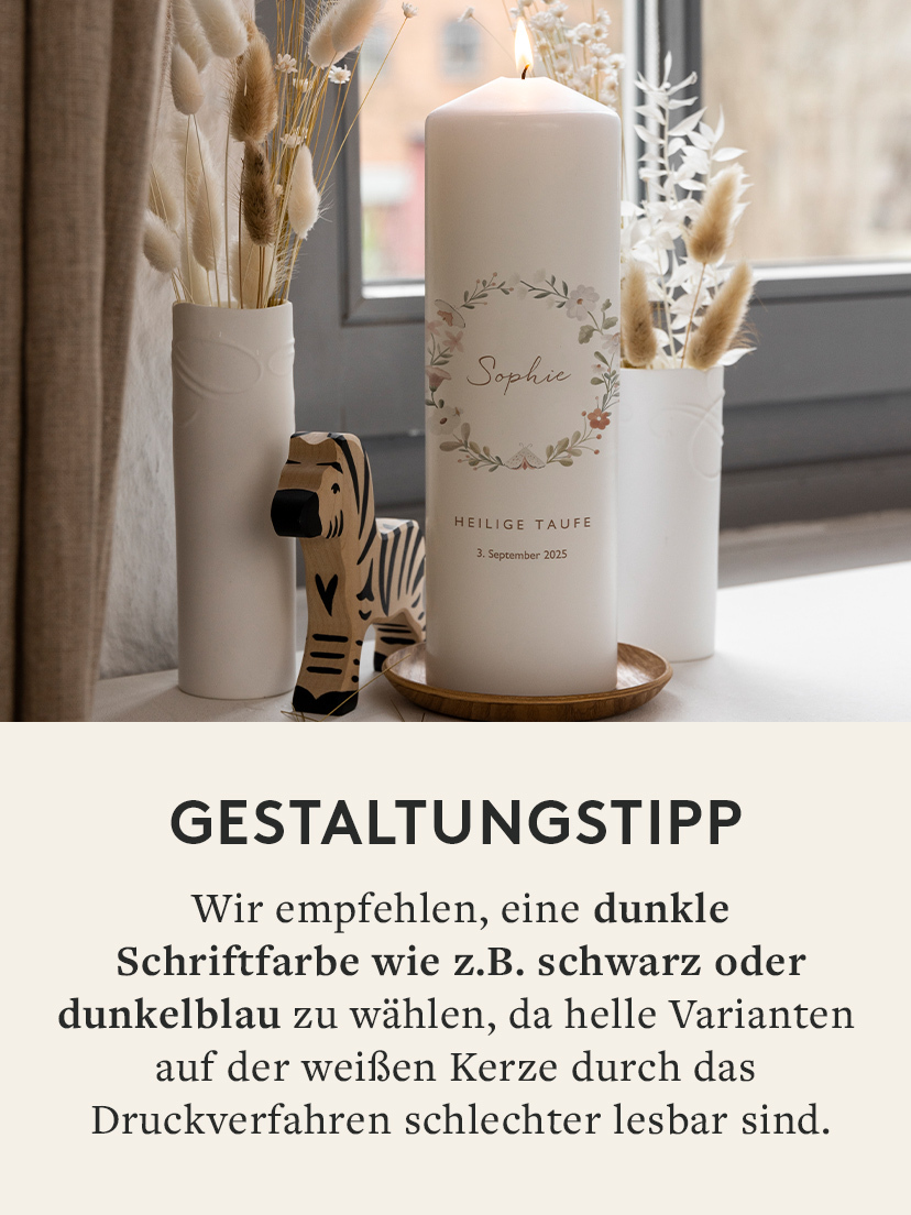 Wir empfehlen, eine dunkle Schriftfarbe zu wählen, da helle Varianten auf der weißen Kerze nicht gut zu erkennen & zu lesen sind.