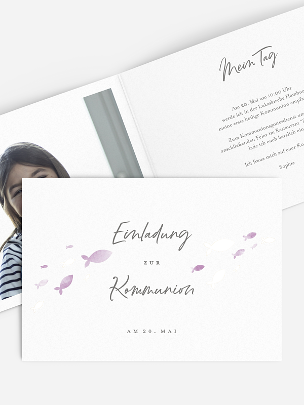 Zu einer so zauberhaften Einladung wird sicher kein Gast nein sagen: die Kommunionskarte "Aquarell Fische".