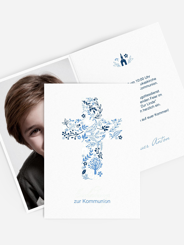 Mit viel Liebe zum Detail: Eine zarte, florale Illustration des Kreuzes schmückt die Kommunionseinladung "Florale Botschaft".