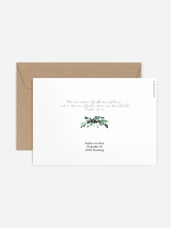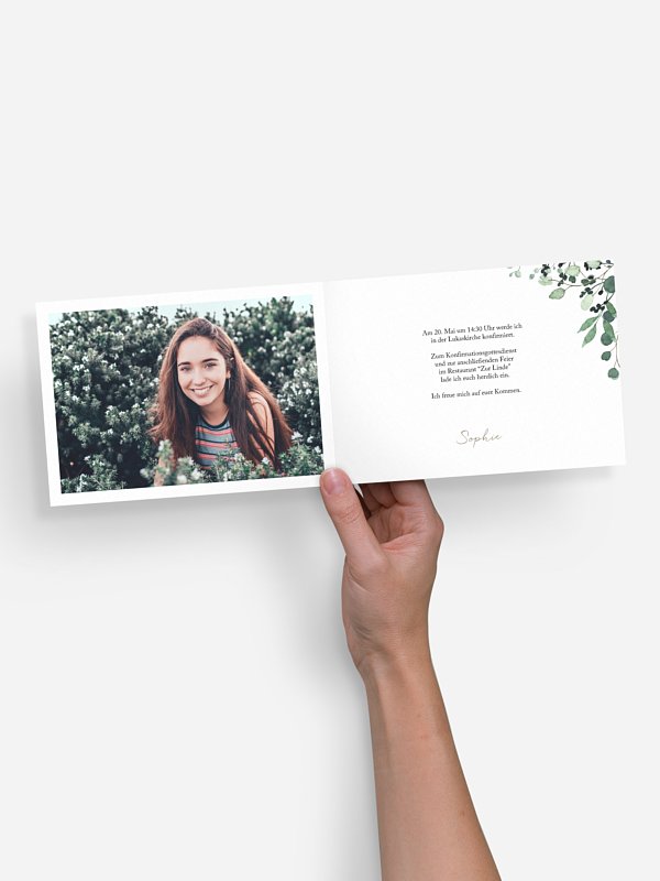 Ein simples grünes Bouquet schmückt die Vorderseite der luftig-leichten Konfirmationseinladung "All The Greenery".
