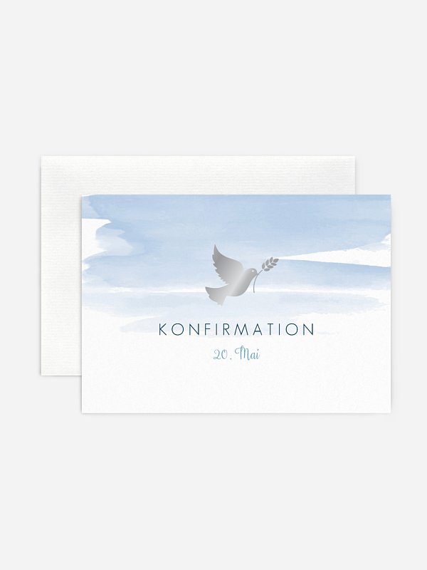Auf den Konfirmationseinladungen "Aquarellbild" wird die traditionelle Taube, klassisch schön und modern in Szene gesetzt.