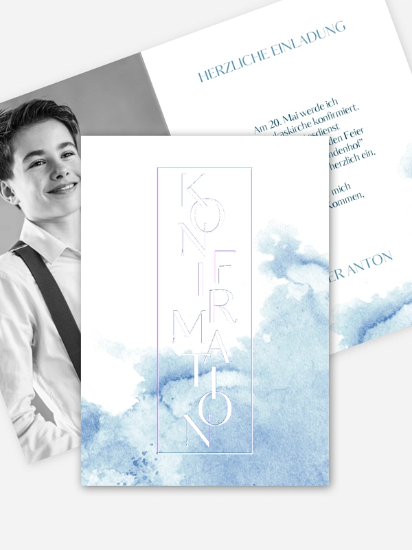 Die Einladungskarte „Klassik Aquarell“ kommt im frischen, jugendlichen Design daher. Der passende Auftakt zur Konfirmation Ihres Kindes.