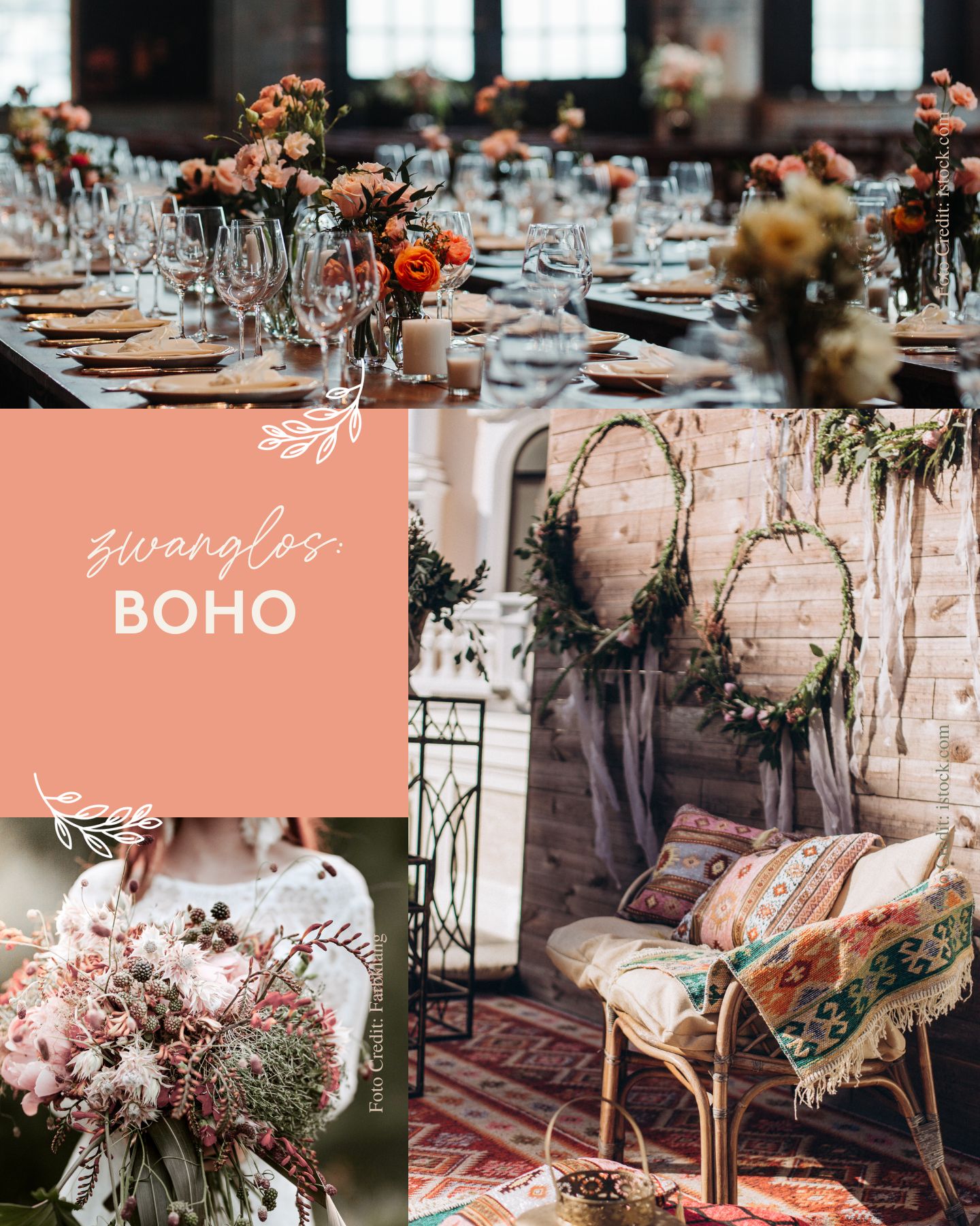 Ihr liebt es eher unkonventionell? Dann ist vielleicht eine Blumendeko à la Bohème das Richtige für eure Hochzeit! Im Brautstrauß sind Blumen der Saison oder Wiesenblumen locker mit Pampasgras gebunden. Auf den Tischen werden meist kleine Sträuße in vielen kleinen Vasen oder Gläsern arrangiert. Kränze ("Flower Hoops") mit viel Grün, Blüten und Bändern eignen sich als Blickfang für die Wand. Bei einer sehr farbenfrohen Umgebung mit unterschiedlichen Mustern ist es ratsam, Akzente zu setzen, damit es nicht zu chaotisch wirkt. In unserem Beispiel greifen die Blumen die Rosé- und Orangetöne der Kissen und Teppiche auf.