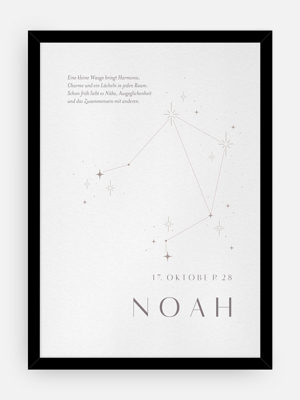 „Sternbild Waage“ bringt Harmonie und Leichtigkeit ins Kinderzimmer. Das Poster erinnert daran, wie viel Freude Balance und kleine Gesten im Leben schenken. Ein herzliches Geschenk zur Geburt, das Eltern und Kind lange begleitet. Hochwertig gefertigt und schnell bei dir.