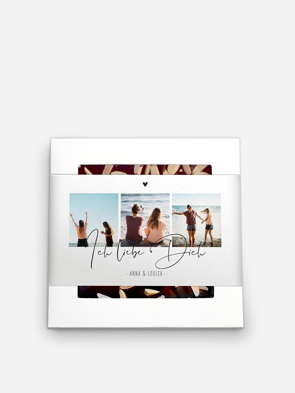 Verschenken Sie die handgeschöpfte Pralinenschokolade mit der personalisierbaren Hülle "Bester Mensch" und verwöhnen Sie Ihre Liebsten zu Weihnachten. Handgeschöpfte Pralinenschokolade mit gerösteten Mandelsplittern Zutaten: Premium-Zartbitterschokolade (Kakaomasse; Zucker; Kakaobutter; Emulgator: SOJAlecithin; natürliches Vanille-Aroma), geröstete MANDELsplitter 10 % Kakao: mindestens 60 % in der Edel-Zartbitter-Schokolade Hergestellt in Deutschland Bitte kühl, dunkel und trocken lagern Gewicht: 80 g