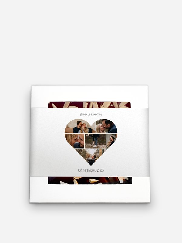 Verschenken Sie die handgeschöpfte Pralinenschokolade mit der personalisierbaren Hülle "Im Herzen" und verwöhnen Sie Ihre Liebsten zu Weihnachten. Handgeschöpfte Pralinenschokolade mit gerösteten Mandelsplittern Zutaten: Premium-Zartbitterschokolade (Kakaomasse; Zucker; Kakaobutter; Emulgator: SOJAlecithin; natürliches Vanille-Aroma), geröstete MANDELsplitter 10 % Kakao: mindestens 60 % in der Edel-Zartbitter-Schokolade Hergestellt in Deutschland Bitte kühl, dunkel und trocken lagern Gewicht: 80 g