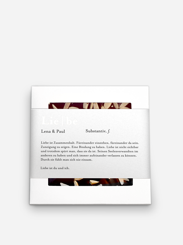 Verschenken Sie die handgeschöpfte Pralinenschokolade mit der personalisierbaren Hülle "Meanings" und verwöhnen Sie Ihre Liebsten zu Weihnachten. Handgeschöpfte Pralinenschokolade mit gerösteten Mandelsplittern Zutaten: Premium-Zartbitterschokolade (Kakaomasse; Zucker; Kakaobutter; Emulgator: SOJAlecithin; natürliches Vanille-Aroma), geröstete MANDELsplitter 10 % Kakao: mindestens 60 % in der Edel-Zartbitter-Schokolade Hergestellt in Deutschland Bitte kühl, dunkel und trocken lagern Gewicht: 80 g