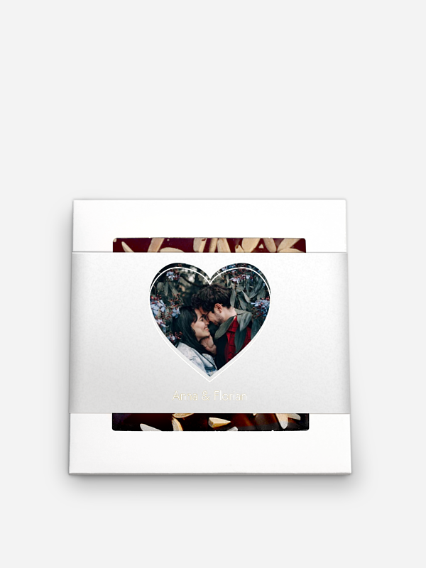 Verschenken Sie die handgeschöpfte Pralinenschokolade mit der personalisierbaren Hülle "Valentinsherz" und verwöhnen Sie Ihre Liebsten zu Weihnachten. Handgeschöpfte Pralinenschokolade mit gerösteten Mandelsplittern Zutaten: Premium-Zartbitterschokolade (Kakaomasse; Zucker; Kakaobutter; Emulgator: SOJAlecithin; natürliches Vanille-Aroma), geröstete MANDELsplitter 10 % Kakao: mindestens 60 % in der Edel-Zartbitter-Schokolade Hergestellt in Deutschland Bitte kühl, dunkel und trocken lagern Gewicht: 80 g
