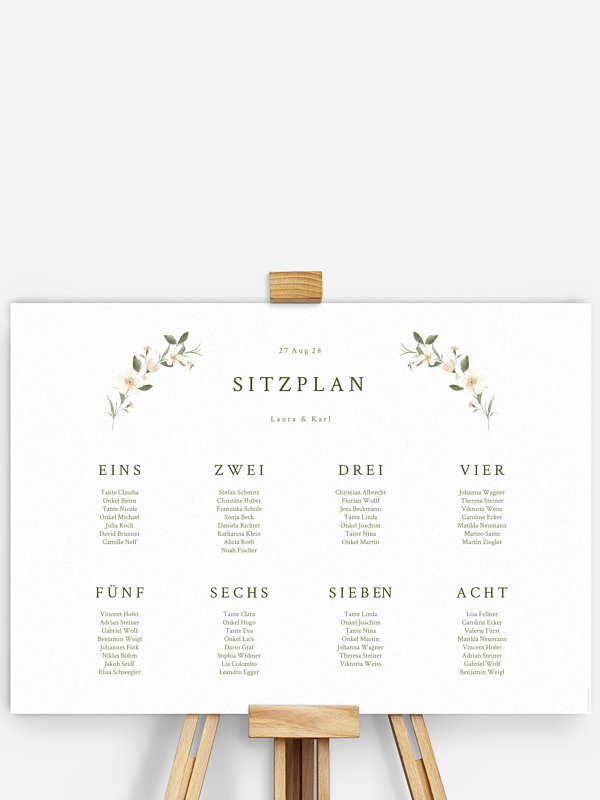 Dekorativ, liebevoll gestaltet und praktisch! Mit dem Sitzplan "Floral Charm" finden Ihre Gäste garantiert den richtigen Tisch.