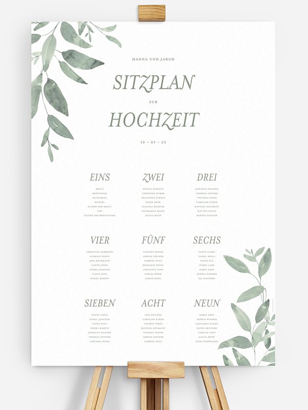 Unser Sitzplan als Plakat "Lovely Sage" bietet Platz für all Ihre Gäste und ist durch die aquarellierten Elemente ein besonderer Hingucker.