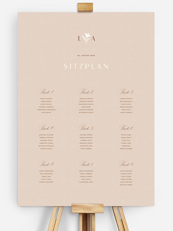Das stilvolle Sitzplan Plakat "Monogram muse" zeigt Ihren Gästen auf einen Blick, an welchem Tisch sie Platz nehmen dürfen – ein eleganter Empfang gleich beim Ankommen.