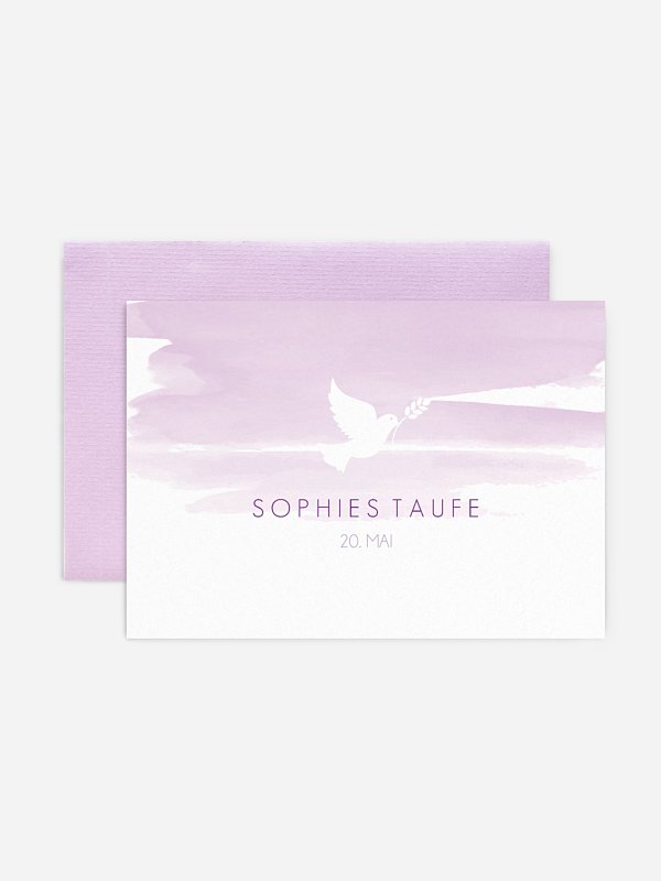 Wie mit zarten Wasserfarben gemalt: Die Taufeinladung „Aquarellbild” mit der Friedenstaube als zentralem Element ist eine klassische und gleichzeitig moderne Papeterie, um stilvoll zur Taufe Ihres Kindes einzuladen.