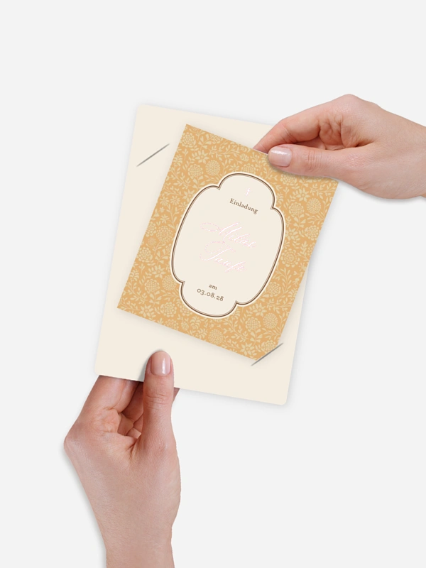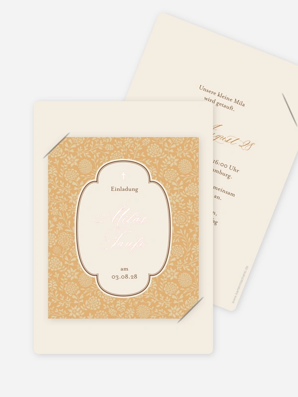 Die Einladung zur Taufe "Classic Garden" fühlt sich an wie ein liebevoller Auftakt zu eurem großen kleinen Tag – warm, ruhig und voller Vorfreude. Das florale Muster und das feine Emblem geben eurer Taufkarte einen zeitlosen Rahmen, in dem Name und Datum ganz natürlich im Mittelpunkt stehen. So wird aus der Einladung zur Taufe ein persönlicher Gruß, den man gern aufhebt. Du kannst deine Taufkarte ganz einfach im Gestaltungs-Tool gestalten, und wir sorgen für hochwertige Papiere und schnellen Versand. Wenn du magst, stell dir gleich ein stimmiges Set für die Taufe zusammen.