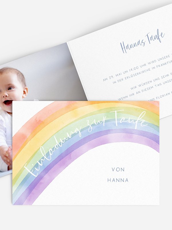Die Taufeinladung "Regenbogen" bietet nicht nur viel Platz für einen einladenden Text, sondern verzaubert auch durch seine schöne Regenbogen Illustration.