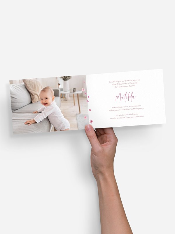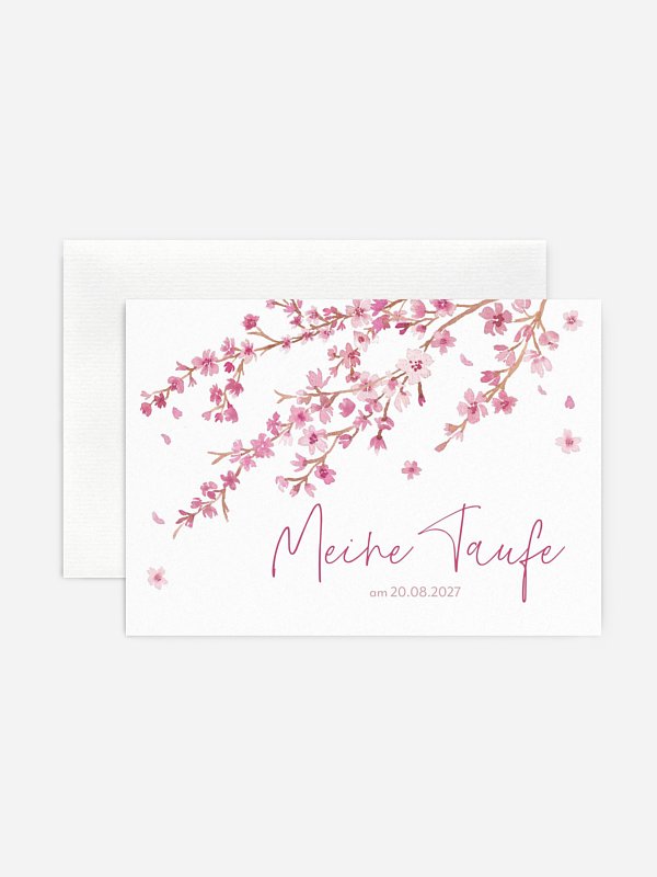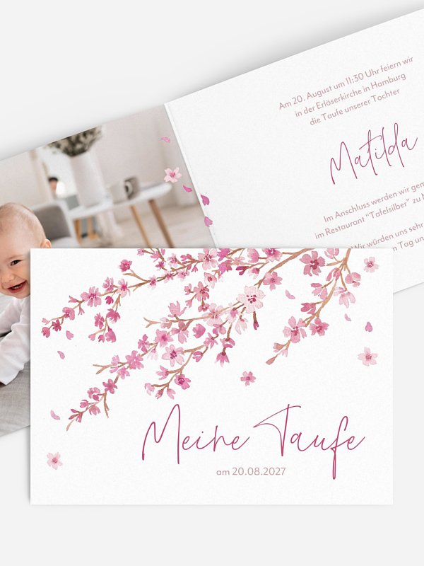 Filigran und in wunderschönen Farben illustriert. Die Taufeinladung "Sakura" sorgt für den ganz besonderen Auftritt Ihres kleinen Täuflings.