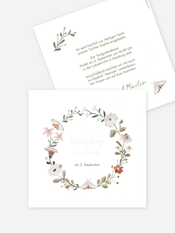 Zauberhafte Einladungskarte mit verträumten Illustrationen: auf der Taufeinladung "Waldspiel" wird der Schriftzug von einem liebevoll gestalteten Kranz umgeben.
