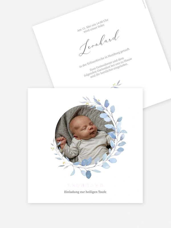 Zarte, aquarellierte Zweige umgeben das Foto deines Schatzes auf der Taufeinladung "Wiesenbouquet" und verleihen deiner Post einen besonders natürlichen Rahmen. Mit diesem liebevollen Design kannst du eure Einladung zur Taufe ganz persönlich gestalten und die Vorfreude auf das gemeinsame Fest mit deinen Lieblingsmenschen teilen. Dank der hochwertigen Papiere fühlen sich eure Karten genauso gut an, wie sie aussehen. Über die einfache Konfiguration im Gestaltungs-Tool fügst du deine eigenen Worte und Bilder im Handumdrehen ein. Gestalte jetzt dein Set direkt online.