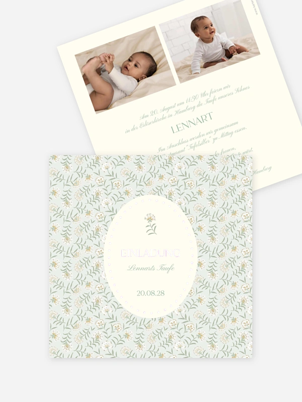 Unsere liebevoll gestaltete Taufeinladung "Wiesenflüstern" umrahmt die Einladung zum ersten großen Fest deines Lieblings mit einem zarten, floralen Muster. Die Kombination aus verspielten Illustrationen und klassischer Eleganz macht es dir leicht, eure Liebsten auf ganz herzliche Weise zu diesem besonderen Meilenstein einzuladen. Dank der intuitiven Konfiguration im Gestaltungs-Tool fügst du dein liebstes Foto und alle wichtigen Details im Handumdrehen ein. Wir sorgen mit hochwertigem Druck dafür, dass deine Taufkarten zu einer bleibenden Erinnerung für die ganze Familie werden. Gestalte jetzt dein Set direkt online.