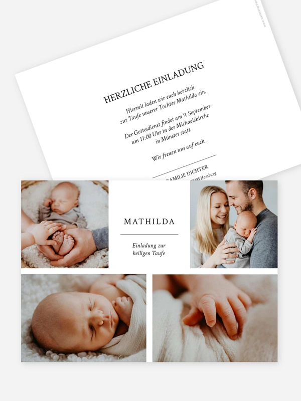 Mit der Einladung zur heiligen Taufe "Zarte Momente" teilst du die Freude über euren kleinen Schatz auf eine besonders herzliche Weise mit euren Lieblingsmenschen. Die liebevolle Gestaltung bietet viel Platz für eure schönsten Schnappschüsse.