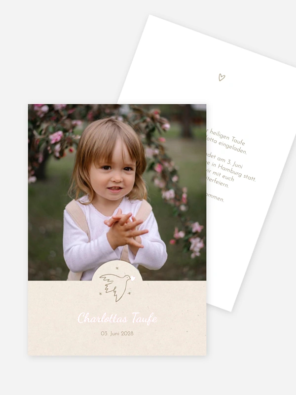 Unsere liebevoll gestaltete Taufeinladung "Zartes Vöglein" verkündet die bevorstehende Taufe deines Kindes auf eine besonders sanfte und verspielte Weise. Das charmante Motiv einer kleinen Friedenstaube verleiht der Karte eine tiefe Symbolik und macht sie zu einem wundervollen Botschafter für euer Familienfest. Dank der einfachen Konfiguration im Gestaltungs-Tool kannst du deine Taufkarten ganz persönlich gestalten und dein liebstes Foto mühelos einfügen. Wir unterstützen dich dabei mit hochwertigen Papieren und einer schnellen Lieferung, damit du dich ganz auf die Vorfreude konzentrieren kannst. Gestalte jetzt dein Set direkt online.