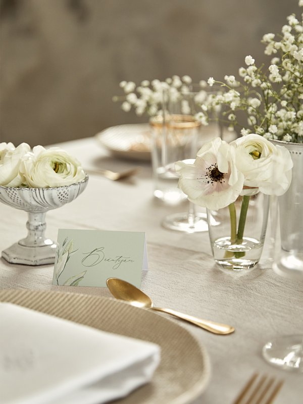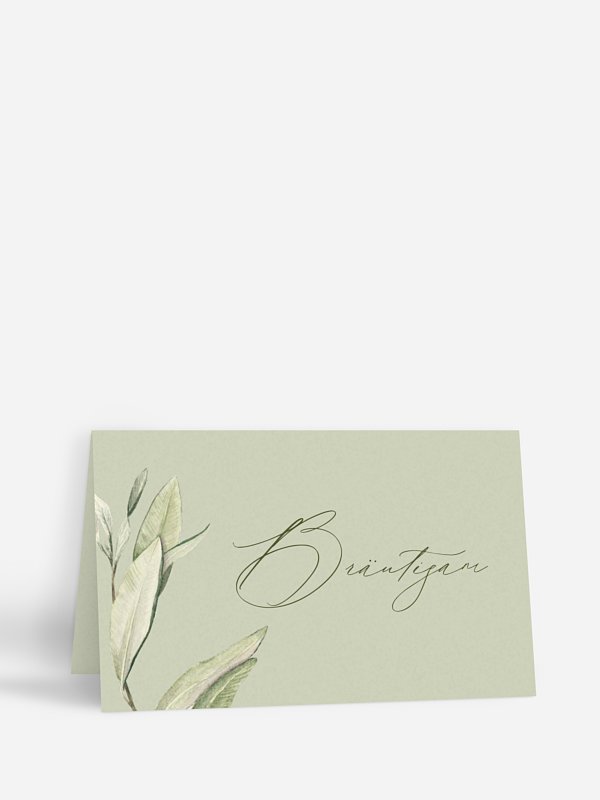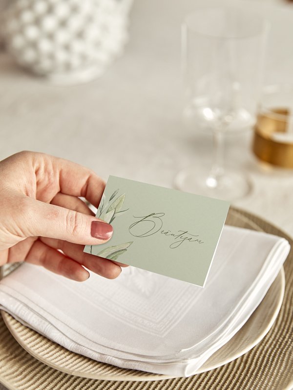 Mit der Tischkarte "Elegant Olive" setzen Sie mediterrane Akzente auf Ihrer Hochzeitstafel und sorgen für eine stilvolle Platzierung Ihrer Gäste.