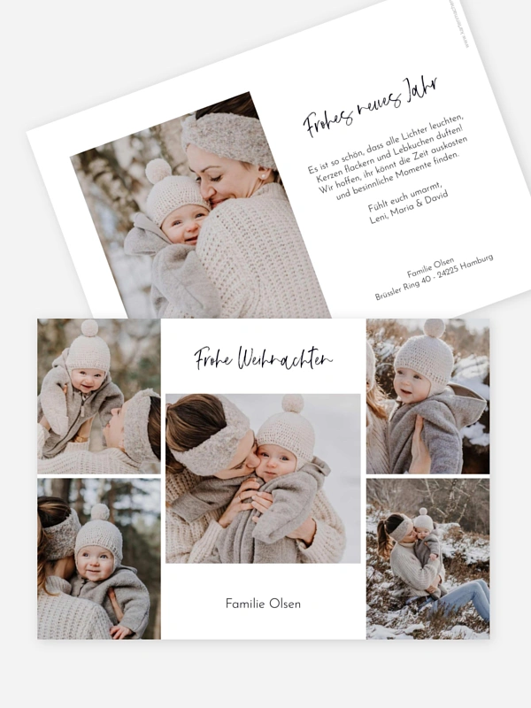 Verschicke mit der Weihnachtskarte "Festblicke" eine herzliche Umarmung aus Papier und teile eure schönsten Familienmomente des vergangenen Jahres mit deinen Lieblingsmenschen. Die moderne Collage bietet viel Platz für eure gemeinsamen Erinnerungen und lässt deine Weihnachtswünsche besonders persönlich wirken.