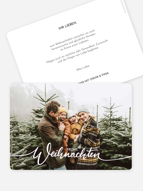 Die Weihnachtskarte "Simply Festive" bringt das Gefühl eines stillen Wintermoments direkt in dein Zuhause. Das natürliche Design mit persönlichem Foto lässt deine festlichen Grüße besonders echt und herzlich wirken – ganz ohne Kitsch. Perfekt, um Familie und Freund:innen mit liebevollen Worten zu überraschen. Gedruckt auf hochwertigem Papier und mit wenigen Klicks im Gestaltungs-Tool anpassbar. So wird deine Weihnachtskarte im Handumdrehen zu einem kleinen Stück Freude.