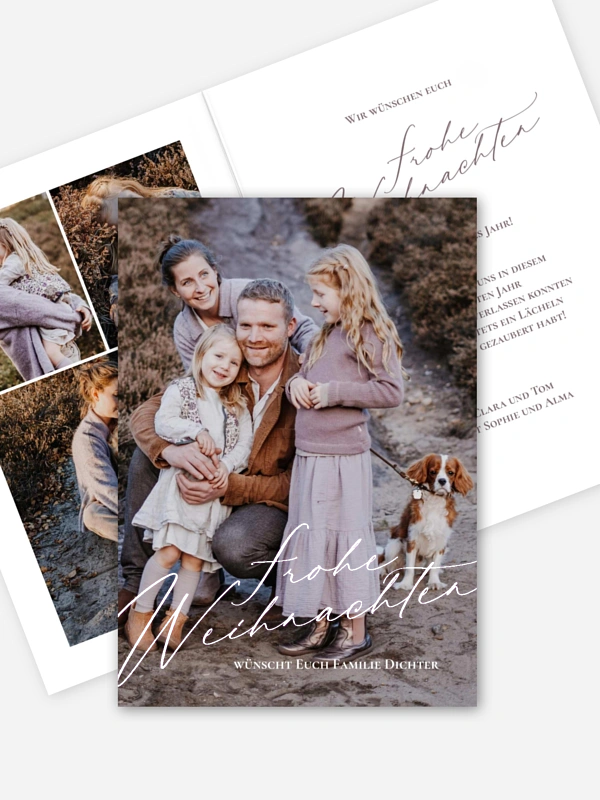 Die Weihnachtskarte "Winterglanz" strahlt festliche Wärme und stilvolle Eleganz aus. Sie ist die ideale Wahl, um euren Liebsten persönliche Weihnachtsgrüße zu schicken und besondere Momente zu teilen. Mit wenigen Klicks kannst du sie ganz einfach im Gestaltungs-Tool anpassen – hochwertig gedruckt und schnell geliefert, bereit zum Verschicken.