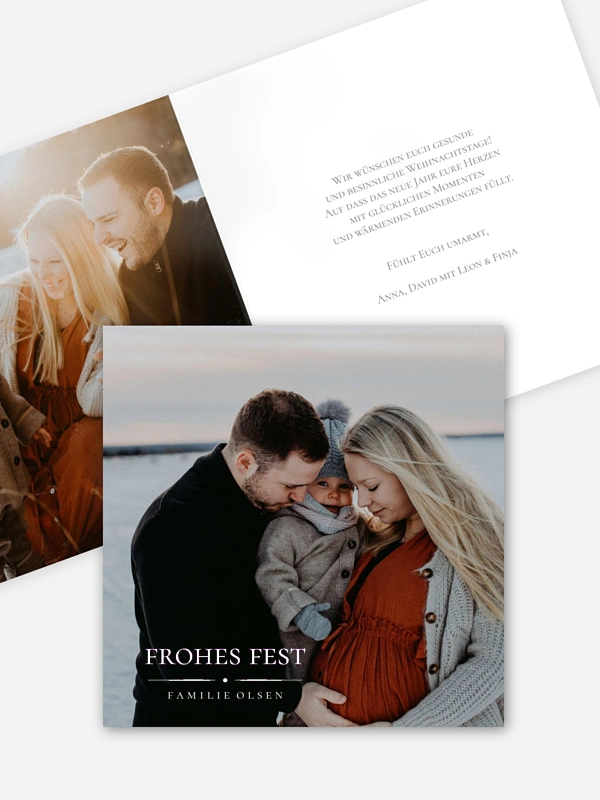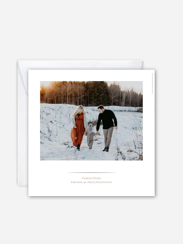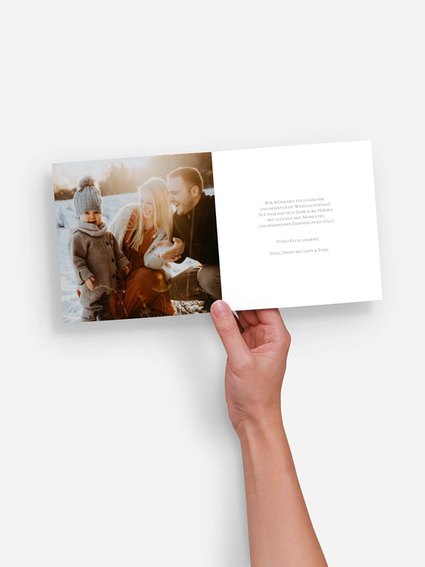 Mit der Weihnachtskarte "Zarte Feinheit" verschickst du dieses Jahr besonders liebevolle Botschaften an deine Familie und Freunde. Das Design fängt die ruhige Magie der Adventszeit ein und bietet den perfekten Rahmen für deine persönlichen Worte zum Fest. Dank der einfachen Konfiguration im Gestaltungs-Tool wird das Erstellen deiner Karte zum reinen Vergnügen. Wir drucken deine Herzenspost auf hochwertigen Papieren und sorgen für eine schnelle Lieferung direkt zu dir nach Hause. Gestalte jetzt dein Set und zaubere deinen Liebsten ein Lächeln ins Gesicht.