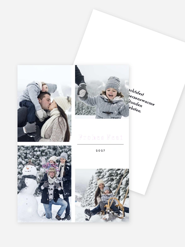 Mit der Weihnachtskarte "Zarte Momente" teilst du eure schönsten Familienmomente des vergangenen Jahres auf eine besonders herzliche Weise mit deinen Lieblingsmenschen. Die stimmungsvolle Collage bietet viel Platz für eure liebsten Schnappschüsse, damit ihr eure Freude so echt und nahbar verschicken könnt, wie ihr sie gemeinsam erlebt habt.