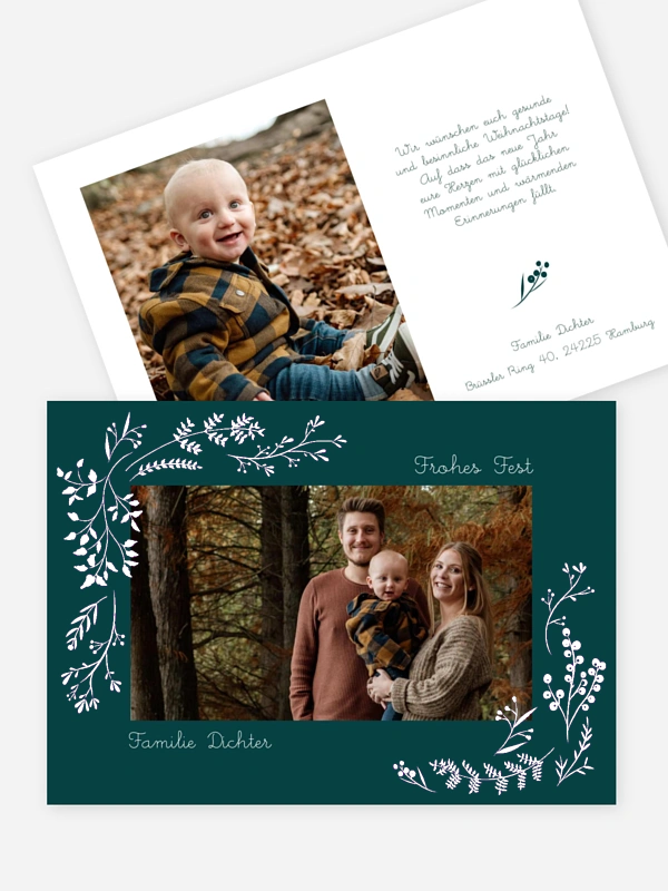 Mit der Weihnachtskarte "Zweigpoesie" verschickst du dieses Jahr eine besonders herzliche Umarmung aus Papier an deine Lieblingsmenschen. Die filigranen Illustrationen kombiniert mit euren schönsten Familienfotos machen diese Karte zu einer wertvollen Erinnerung, die man sich immer wieder gerne ansieht. Deine individuellen Texte lassen sich dank der einfachen Konfiguration im Gestaltungs-Tool mühelos einfügen. Wir drucken deine Karte auf hochwertigen Papieren, damit deine Post pünktlich und wunderschön bei dir ankommt. Gestalte jetzt dein Set direkt online und bereite deinen Liebsten eine kleine Freude zum Fest.