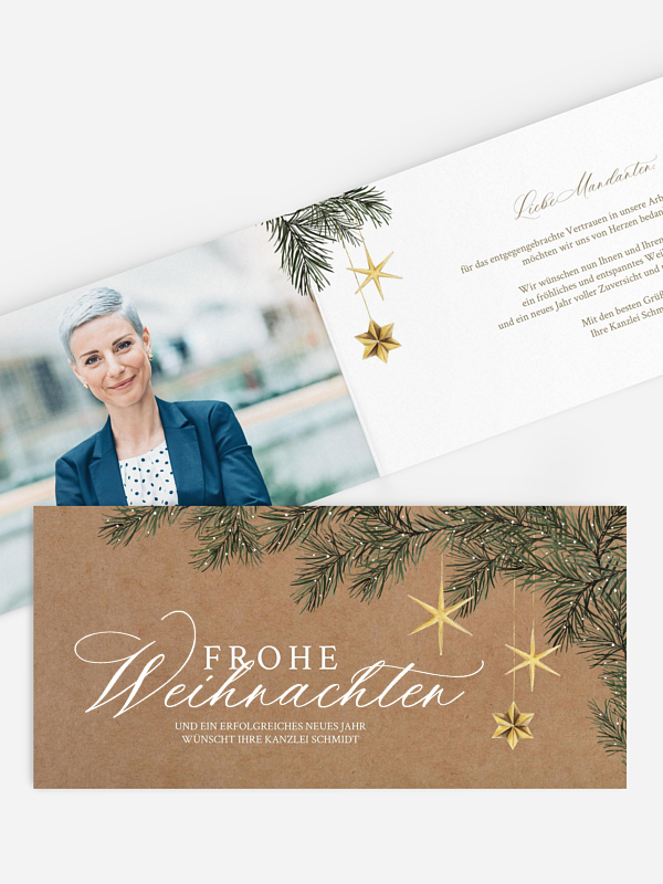 Für die Extraportion Weihnachtsgefühl. Die Karte "Festive Stars" besticht mit kunstvoll gezeichneten Designelementen, die Ihre Festtagsgrüße an Partner, Mitarbeiter und Kunden stilsicher übermitteln.