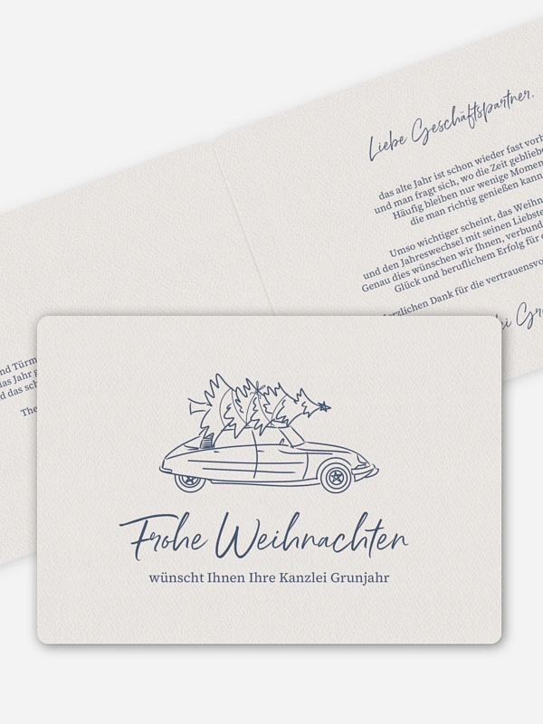 Senden Sie Ihre geschäftlichen Weihnachtsgrüße in diesem Jahr auf eine besonders charmante Reise mit unserer Weihnachtskarte "Vintage Car". Das nostalgische Motiv des Oldtimers, der den Weihnachtsbaum nach Hause bringt, steht symbolisch für einen erfolgreichen gemeinsamen Weg und übermittelt Ihre Wünsche auf herzliche Weise. Es ist eine stilvolle Geste, um sich bei Kund:innen und Partner:innen für das entgegengebrachte Vertrauen zu bedanken. Der hochwertige Druck auf sorgfältig ausgewählten Materialien sorgt für einen professionellen Eindruck, der in Erinnerung bleibt.